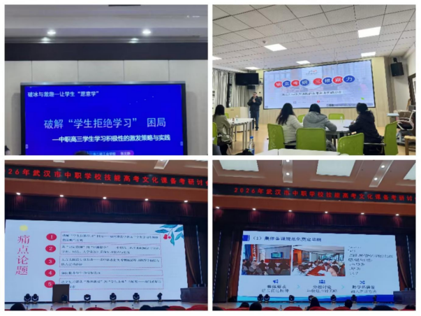 会上,武汉市教育科学研究院职成室周凌主任作武汉市中职技能高考升学总体情况分析报告,从政策导向、数据趋势、备考重点三方面为参会教师搭建了宏观认知框架;在学科分会场,各学科专家围绕语文、数学、 英语学科备考作专题报告,深入剖析近年技能高考命题规律,分享“基础夯实—题型突破—素养提升”三阶备考路径,为我校文化课备考提供了可借鉴的实践方案。我校参会教师认真聆听、细致记录,并在教师交流研讨环节,结合我校学生学情与教学实践,就“如何提升文言文阅读得分率”“数学能力提升与应用策略”等问题与兄弟学校教师展开热烈探讨,进一步拓宽了教学思路。此次市级研讨会的参与,不仅让我校教师精准把握2026年技能高考文化课的命题方向与备考要求,更搭建校际交流的桥梁,为后续我校优化备考策略、提升教学针对性注入新动能。